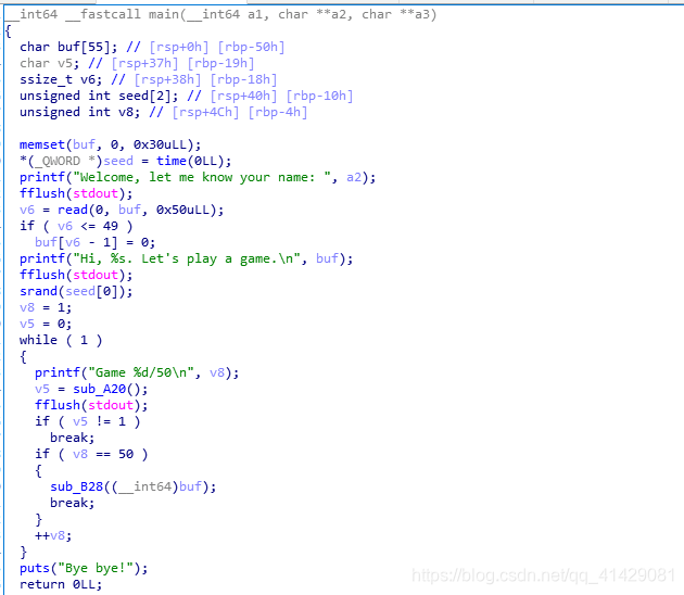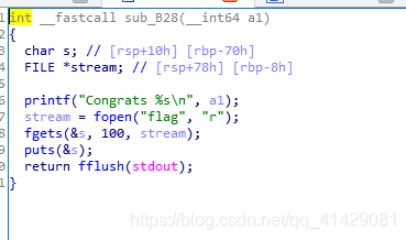 1 | 当回答正确50次时,会执行sub_B28这个函数,读取flag。 |