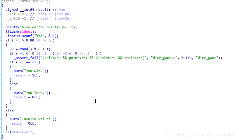 1 | sub_A20()如下,就是比较你输入的数是否和产生的随机数相等 |